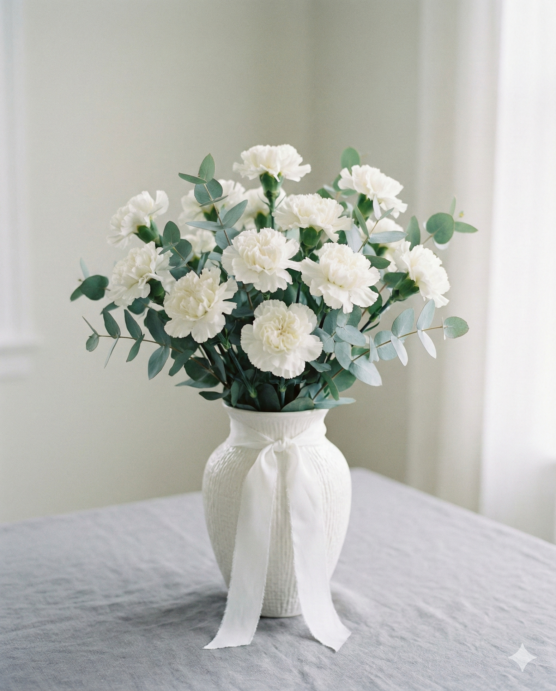 Send a message of peace and comfort during difficult times with this elegant floral gift. It creates a serene and respectful atmosphere instantly upon arrival. This arrangement features a gathering of pure white carnations known for their ruffled petals and lasting beauty. Soft, silver-green eucalyptus branches add natural texture and a calm contrast to the blooms. The flowers rest in an elegant, textured white ceramic vase finished with a soft white ribbon tied at the neck. This bouquet is an appropriate and thoughtful choice for expressing sincere sympathy to a grieving friend or family member. It is also suitable as a peaceful tribute for a funeral or memorial service to honor a loved one. This ready-to-display gift delivers a lasting symbol of hope and remembrance when words are not enough.