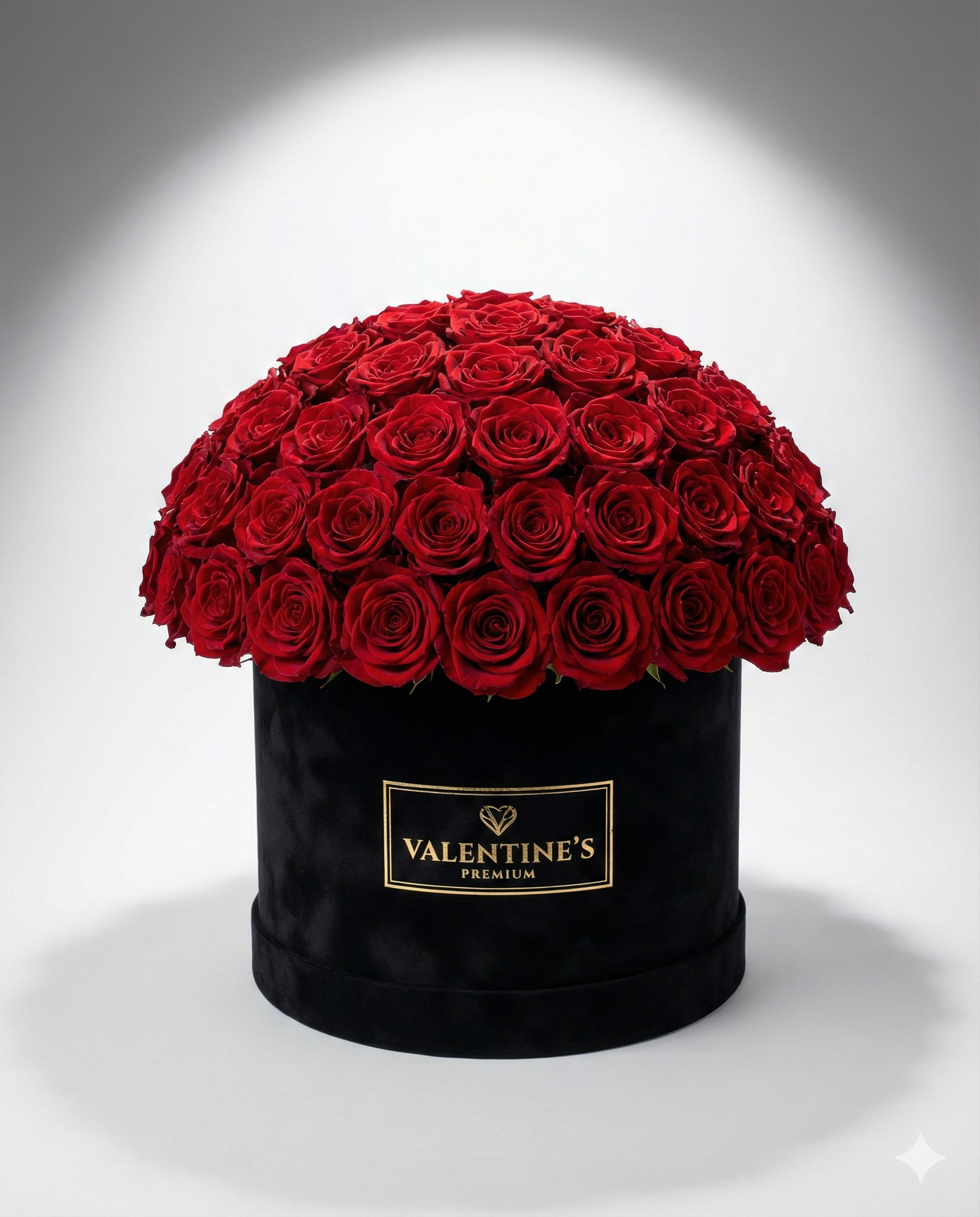 Create a moment of pure, unforgettable romance with this stunning floral masterpiece. It immediately sets a tone of deep passion and luxury the second it is revealed. This arrangement features dozens of premium, velvety deep red roses. They are expertly crafted into a flawless, rounded dome shape that looks perfect from every angle. The blooms are presented in a chic, cylindrical black velvet hat box with elegant gold lettering, adding a touch of sophistication. This is the ultimate gift for Valentine's Day to show your significant other how much you care. It is also a magnificent choice for a special anniversary or a grand romantic gesture. This ready-to-display flower box delivers a powerful and lasting expression of your love and devotion directly to their door.