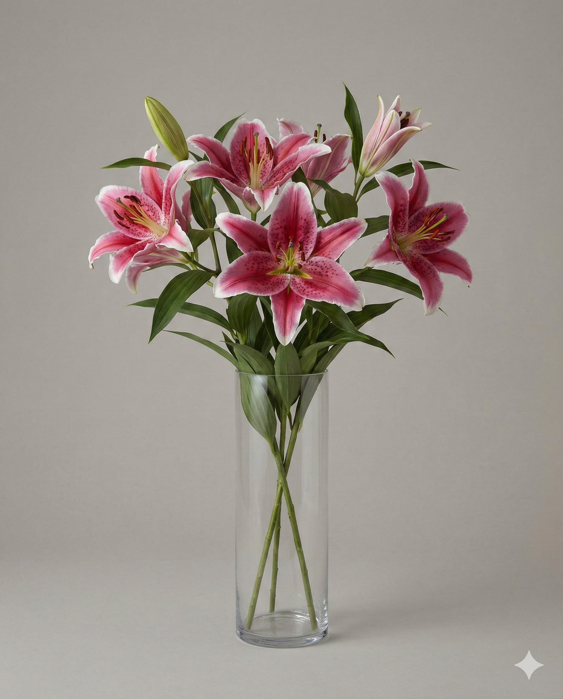 Brighten any room instantly with this stunning floral display. It creates a vibrant and sophisticated mood the moment it arrives. This elegant bouquet features several tall stems of pink Stargazer lilies. Each large bloom showcases deep pink petals with prominent dark spots and crisp white edges. Rich green leaves provide a lush backdrop for the striking flowers. The lilies are arranged in a tall, clear glass cylinder vase that shows off their long stems naturally. This arrangement makes a wonderful birthday gift for a friend who loves bold flowers. It is also a thoughtful and elegant choice for expressing sympathy. This ready-to-display gift delivers lasting freshness and a touch of classic beauty to their home.