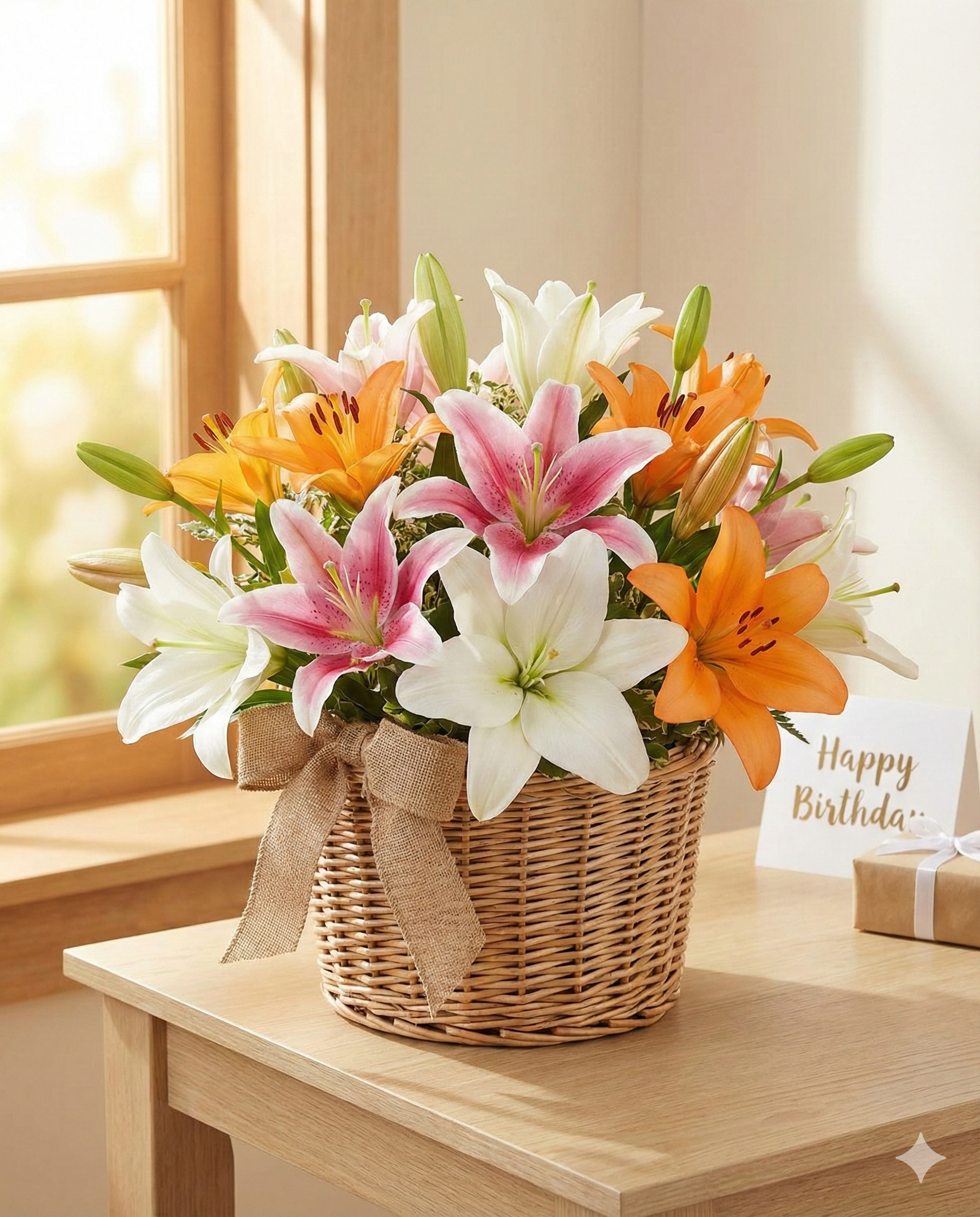 Make their birthday brighter with this cheerful display of vibrant lilies. It brings sunny energy into any room the moment it arrives. This arrangement features a lively mix of large lily blooms in shades of fiery orange, soft pink, and pure white. The fresh flowers are nestled in a charming, rustic woven wicker basket. A natural burlap ribbon bow tied to the front completes the cozy, country-garden look. Plenty of rich green leaves and unopened buds suggest the flowers will bloom and last for days. This basket is the perfect birthday gift for a mother, sister, or friend who loves colorful blooms. It suits anyone who appreciates natural, hearty flowers. This ready-to-gift basket delivers instant joy and a lasting message of celebration straight to their doorstep.