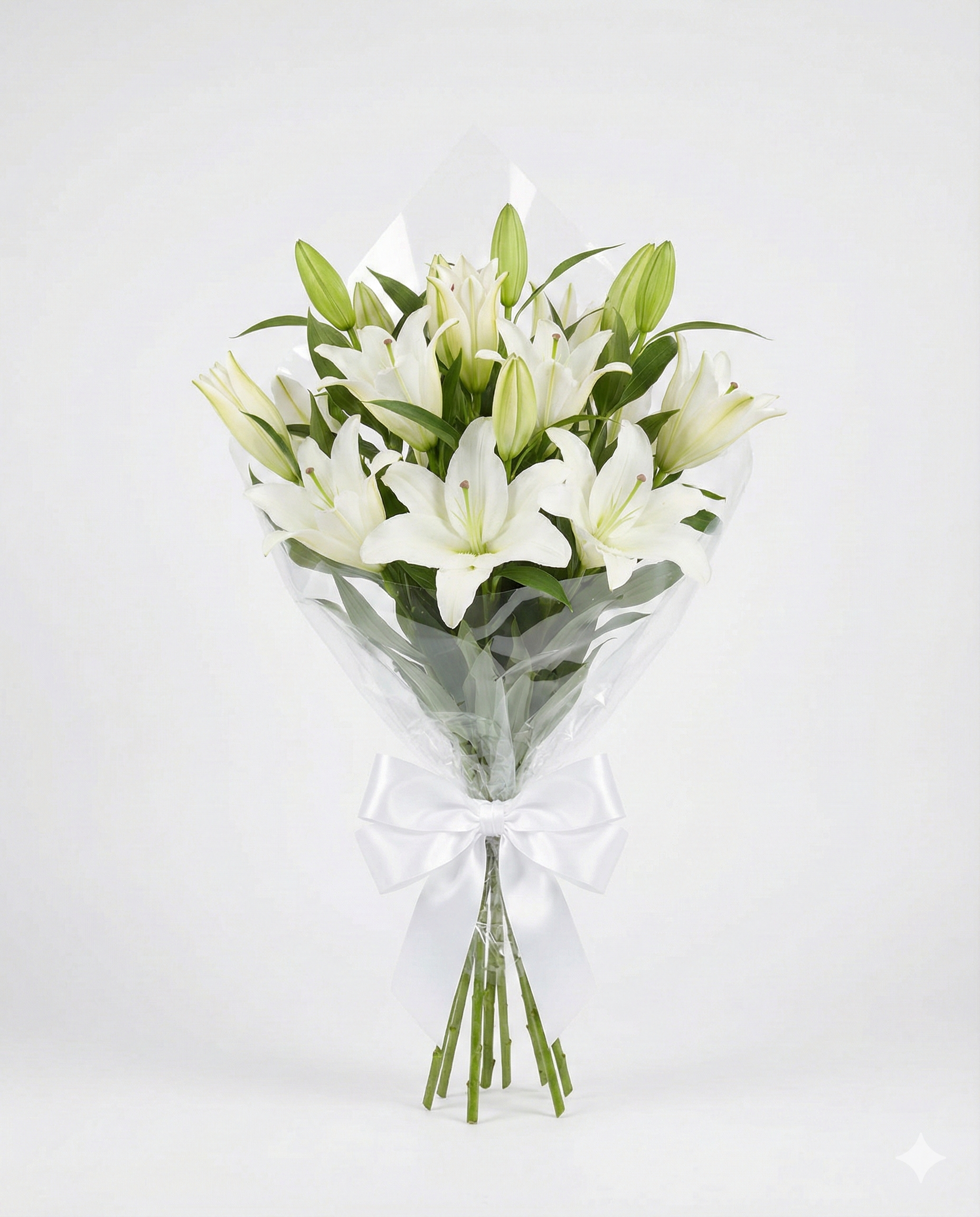 Create a peaceful and sophisticated atmosphere instantly with this classic floral gift. It fills the room with a sweet and calming scent. This bouquet showcases ten stems of premium white Oriental lilies. The large, star-shaped blooms feature pure white petals and distinctive pollen. Lush green leaves provide a fresh contrast to the elegant flowers. They come wrapped in crisp, clear cellophane and are tied with a white satin bow. It is a classic choice for bridal bouquets or elegant centerpieces. This arrangement also serves as a thoughtful sympathy gift for a grieving family. This fragrant gift delivers lasting freshness and graceful beauty to their home.